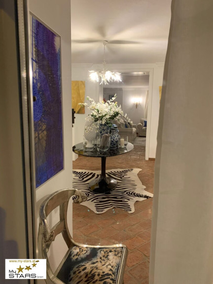Durch die offen gestaltete Eingangshalle gelangen sie in den großzügigen Wohnbereich mit offener Küche. Dem Stil getreu zieren auch hier der alte Ziegelboden, historisch nachgebildete Flügeltüren sowie aufwendig rekonstruierte Stuckarbeiten. Der Wohnbereich bietet ebenfalls Zugang zur charmanten ca. 5 m² Terrasse, von welchen man einen herrlichen Blick in den eigenen, großzügigen ca. 1.000 m² großen Garten genießen kann.