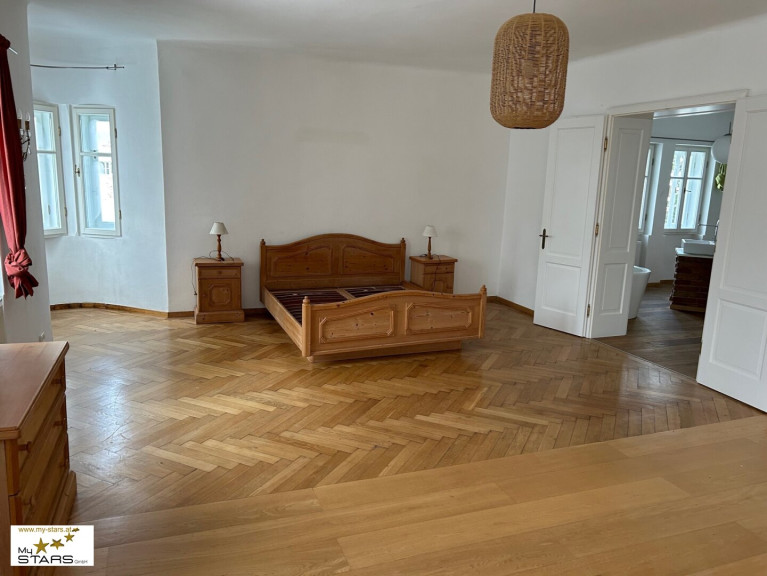 Über die stilgerechte Eichenholztreppe gelangen Sie in das Obergeschoß, wo der großzügig gestaltete Schlafraum mit Ankleide, das hochwertige Badezimmer, ausgestattet mit den einzigartigen Waschtischen, einer offen gestalteten Dusche sowie eine freistehende Badewanne zum Verweilen und Entspannen einladen. Des Weiteren befindet sich noch im Obergeschoß ein Arbeits/Kinderzimmer mit Bad sowie eine separate Toilette. Die Böden sind aus hochwertigem Parkett.