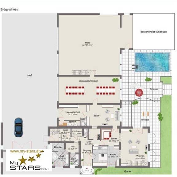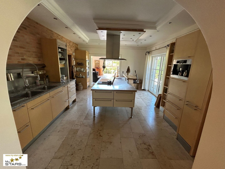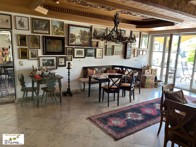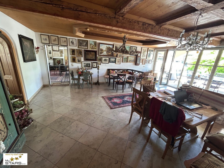 - Im Erdgeschoss gibt es weitere Räume die als Café oder für Veranstaltungen genutzt werden können. Vorhanden ist eine Gastro-Küche, ein Stüberl, und ein großer Veranstaltungsraum. Diese Räume umfassen zusätzlich ca. 140 m².