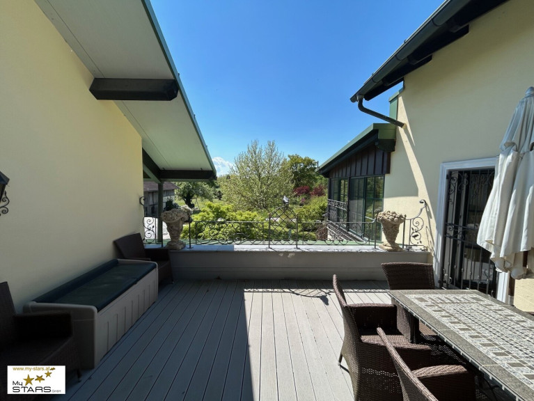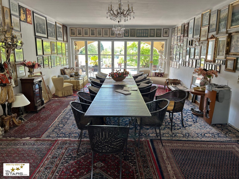 Die Außenanlagen sind einzigartig: große Terrassen, ein parkähnlicher Garten mit altem Baumbestand, der überdachte Pool. Viel Platz zum feiern, entspannen; für sich selbst oder für Gäste.