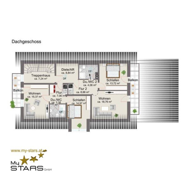 - im Dachgeschoss sind 2 Appartements für Gäste, Freunde, Mitarbeiter… Beide Appartements sind ausgestattet mit Schlafzimmer, Wohnzimmer mit Balkon, Duschbad, sowie eine kleine Küchenzeile.