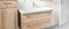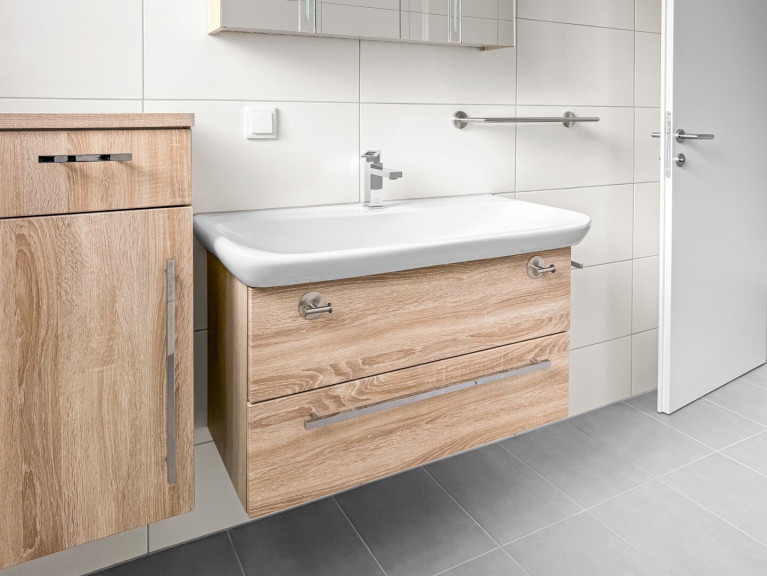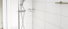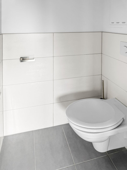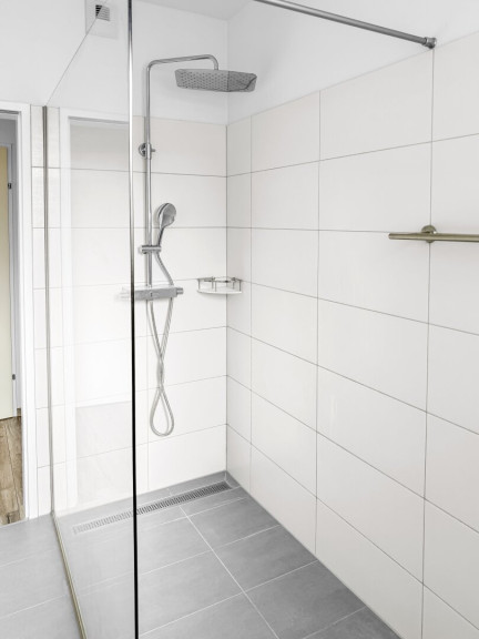 Das Badezimmer mit moderner Walk-in-Dusche und großzügigem Handwaschbecken präsentiert sich zeitlos und hochwertig, während das separate WC zusätzlichen Komfort im Alltag schafft.