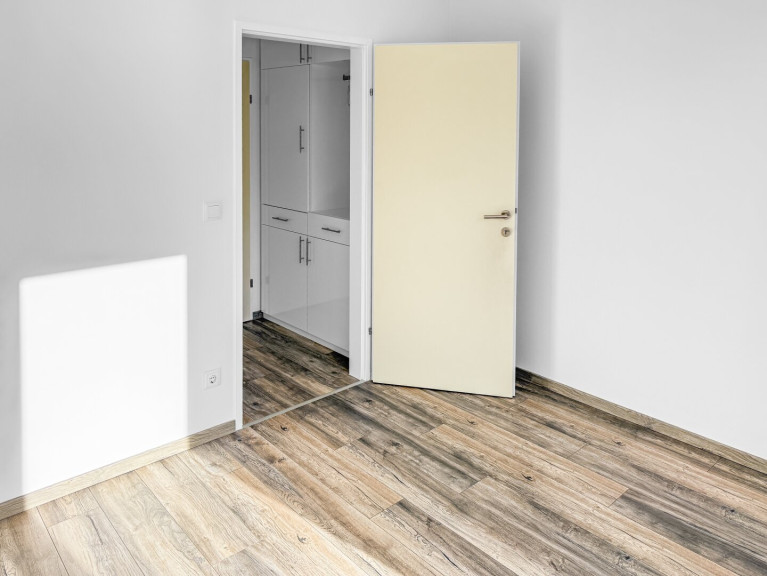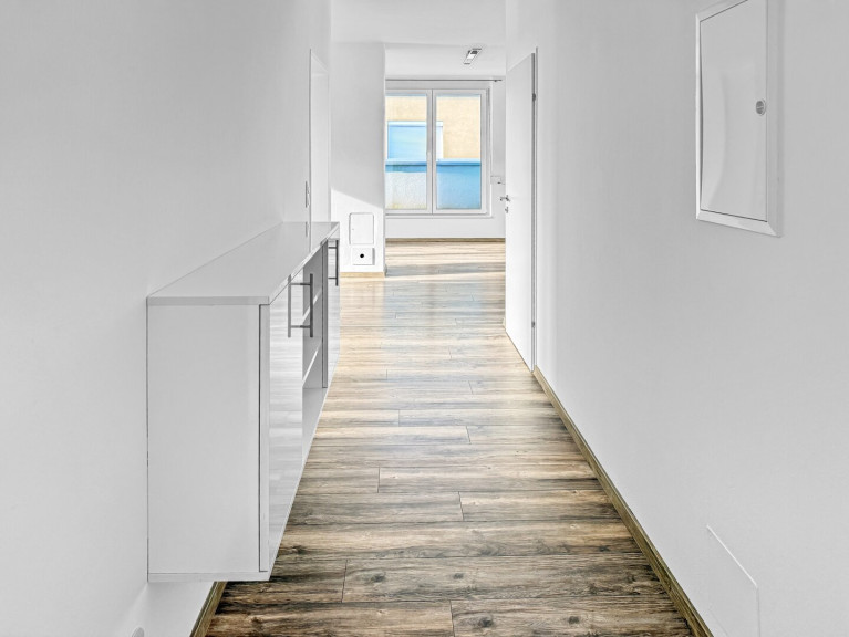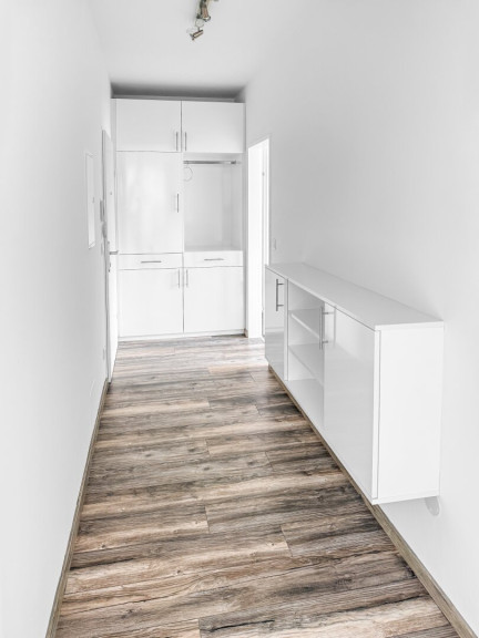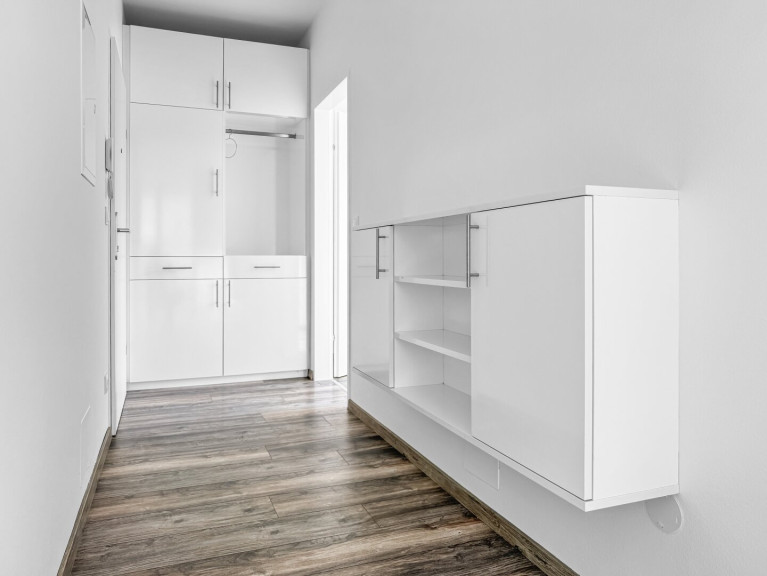 Bereits beim Eintreten empfängt Sie ein zentraler Vorraum mit maßgefertigten Einbauschränken, die nicht nur ästhetisch überzeugen, sondern auch großzügigen Stauraum bieten und für ein aufgeräumtes, harmonisches Wohngefühl sorgen.