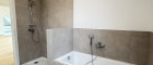 Das modern gestaltete Badezimmer verfügt über Badewanne sowie separate Dusche. Hochwertige keramische Beläge und eine klare Formensprache schaffen eine ruhige, zeitlose Ästhetik.