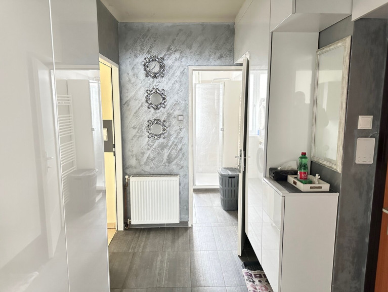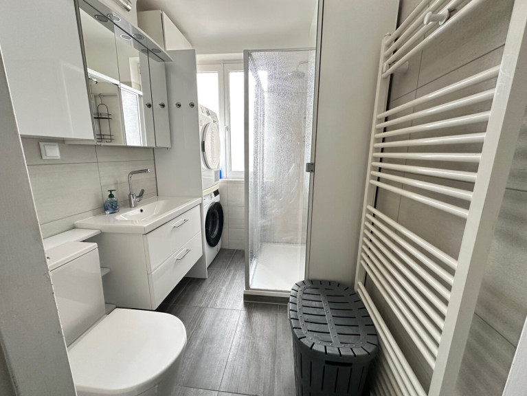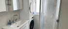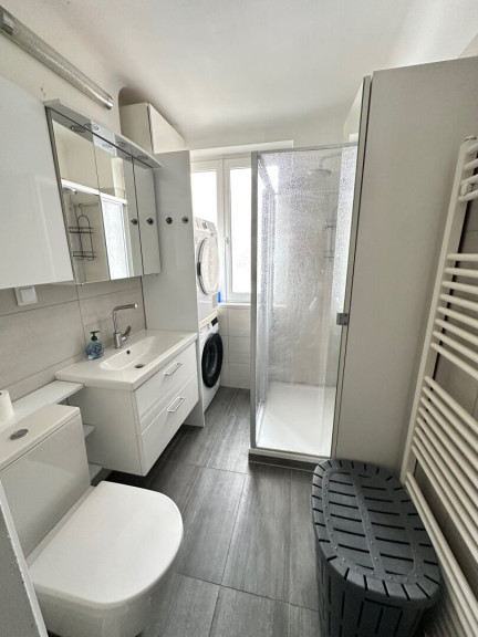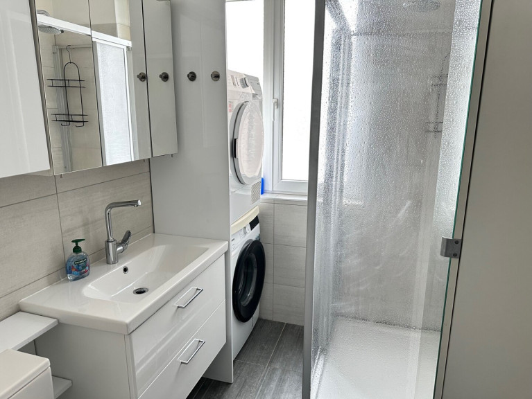 - Badezimmer: Mit WC, Handwaschbecken, Dusche und Waschmaschine/Trockner sowie einem Fenster zum Innenhof