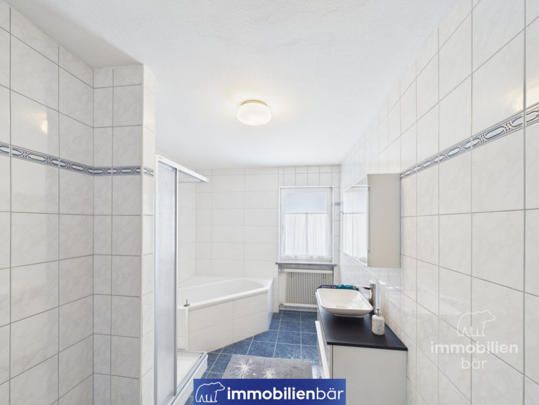 Fliesen, Laminatboden, Öl, Heizofen, Zentralheizung, Einbauküche, Bad mit Fenster, Badewanne, Dusche, Garage, Parkplatz