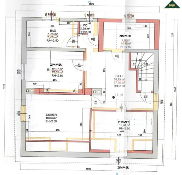 Über die Stiege der Diele gelangt man ins Dachgeschoss (fast keine Dachschrägen, nur bei den beiden straßenseitigen Zimmern).