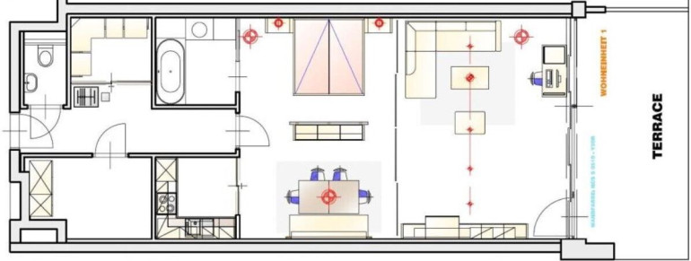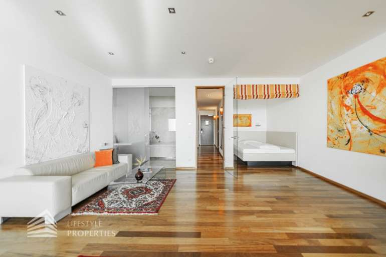 Bei Betreten der Wohnung gelangen Sie in den Vorraum, welcher genügend Platz für eine Garderobe bietet. Dieser führt Sie in den mit natürlichem Licht durchfluteten Wohnraum. Auf der großzügigen Fläche können Sie Ihren Gestaltungsvorstellungen freien Lauf lassen. Sonnenlicht, welches durch die Glasfront scheint, schafft eine angenehme Wohlfühlatmosphäre. Der Raum bietet Ihnen zusätzlich zu einem Schlafbereich ausreichend Platz für eine Küche, eine Couch sowie einen Esstisch. Von hier aus gelangen Sie zum Highlight der Wohnung, auf die ca. 21 m² große Terrasse. Umgeben von Weingärten und Wald lädt die Terrasse mit einem atemberaubenden Blick über Wien zum Entspannen und Verweilen an der frischen Luft ein. Hier haben Sie ausreichend Platz, um Ihre eigene Wohlfühloase im Freien zu errichten. Das Badezimmer ist mit einer Badewanne und einem Waschtisch ausgestattet ist. In das separate WC, den Abstellraum und das Ankleidezimmer gelangen Sie über den Vorraum. Die Wohnung ist mit einer Fußbodenheizung ausgestattet.