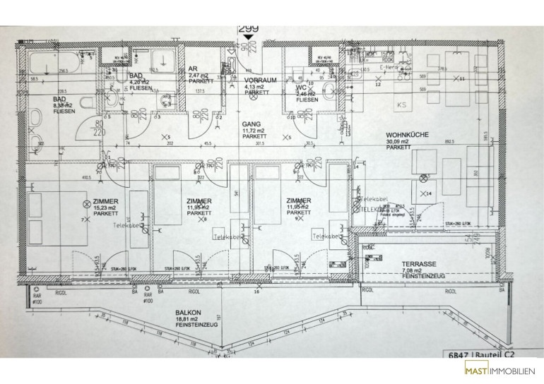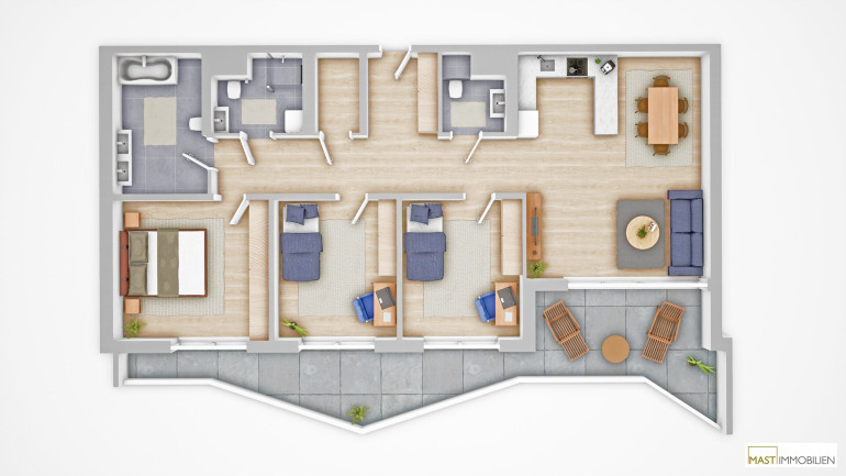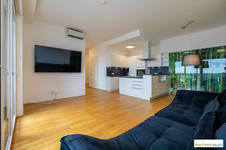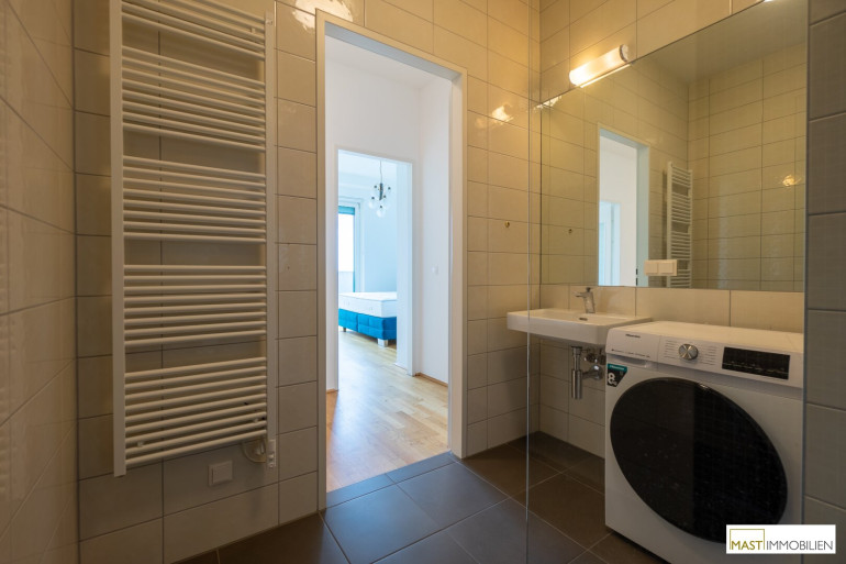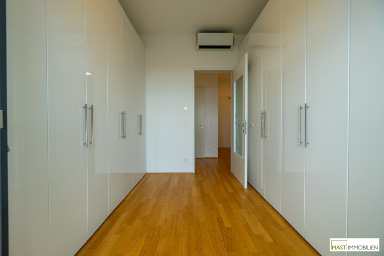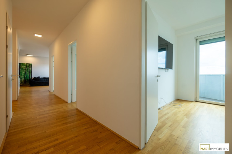 Nach Eintritt in die Wohnung gelangen Sie in ein ca. 16 m² großes Vorzimmer das sich direkt mit dem Flur der Wohnung verbindet. Sämtliche Räumlichkeiten sind direkt vom Vorzimmer aus begehbar. Das Elternschlafzimmer mit ca. 15 m² und die beiden Kinderzimmer die sich auch optimal als Schrankraum, Home-Office oder Gästezimmer eignet, umfassen eine Fläche von je 12 m². Die beeindruckende Wohnung ist auch mit 2 Bädern ausgestattet, Bad Nr. I wurde mit einem Doppelwaschbecken, Wanne, Dusche & WC ausgestattet, das Badezimmer Nr. II verfügt über eine Dusche und einen Waschmaschinenanschluss. Selbstverständlich gibt es ein separates Gäste WC mit Handwaschbecken. Das sonnig ausgerichtete Wohnzimmer inkl. einer hochwertigen Einbauküche inkl. MIELE Geräte bietet so wie ALLE Nebenräumlichkeiten einen direkten Zugang auf die ca. 25 m² große Außenfläche. Für Gegenstände die man nicht immer sehen möchte, gibt es ein Abstellraum im Ausmaß von ca. 2,50 m².