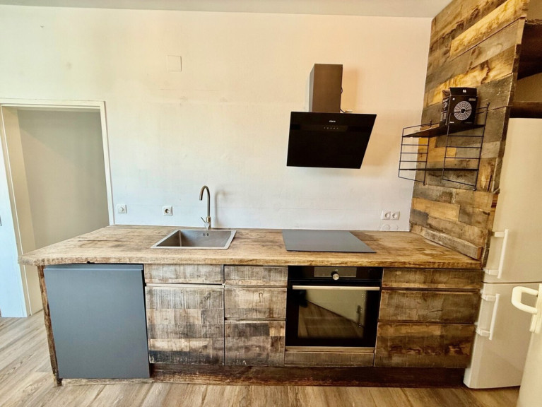 - offener Wohnraum mit Küchennische (moderne Holzküche mit Kühl- Gefrier- Kombigerät, Herd, Geschirrspüler)