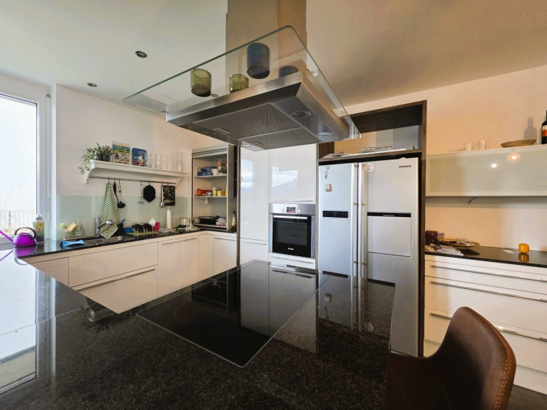 Herzstück der Wohnung ist der beeindruckend große Wohn-, Koch- und Essbereich mit rund 44 m². Die hochwertige Küche überzeugt mit durchdachter Ausstattung, viel Arbeitsfläche und bietet beste Voraussetzungen für angenehmes Kochen mit Blick in die umliegende Berglandschaft.