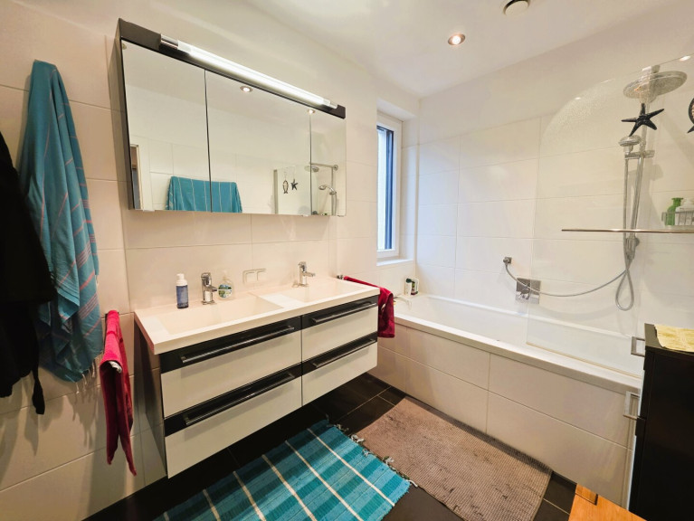 Zwei Schlafzimmer sowie das Badezimmer sind über eine kleine Diele verbunden und separat zugänglich. Diese Raumaufteilung sorgt für zusätzlichen Komfort – besonders wenn Besuch da ist und im Schlafbereich Ruhe gewünscht wird.