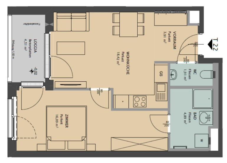 Die Wohnung verfügt über ca. 45 m² Nutzfläche und einem Balkon. Die Wohnräume sind mit Parkettboden, die Nassräume mit Fliesen ausgestattet. 3-fach-verglaste Fenster mit elektrischer Außenbeschattung sorgen für angenehmes Raumklima.