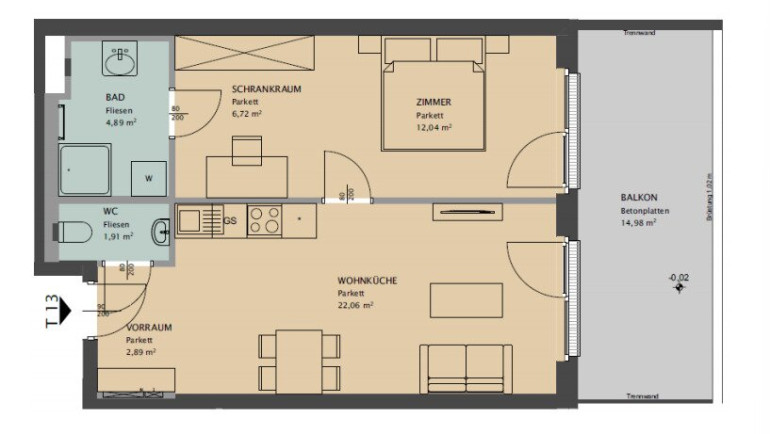 Die Wohnung verfügt über ca. 51m² Nutzfläche und einem Balkon. Die Wohnräume sind mit Parkettboden, die Nassräume mit Fliesen ausgestattet. 3-fach-verglaste Fenster mit elektrischer Außenbeschattung sorgen für angenehmes Raumklima.