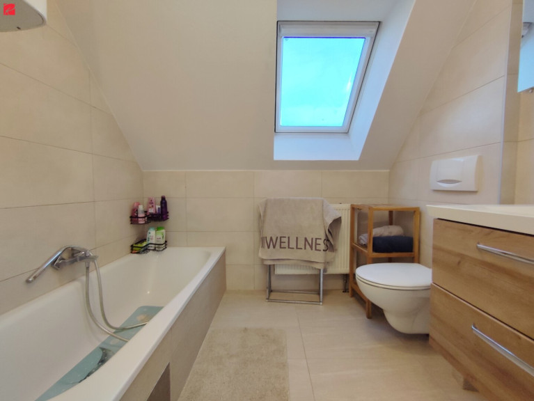 Im oberen Stock befinden sich zwei weitere ruhige Zimmer und ein stilvolles Badezimmer mit Badewanne, diesesund die Toilette wurden 2021 modernisiert.