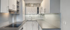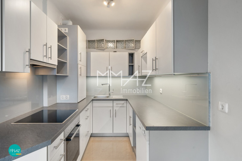 Die moderne Einbauküche ist mit einem 4-Platten E-Herd, Backofen, Dunstabzug, einem Geschirrspüler und viel Stauraum ausgestattet.