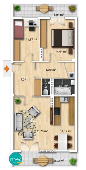 Vom großzügigen Eingangsbereich mit einem praktischen Einbau-/Garderobenschrank sind die beiden Schlafzimmer sowie der helle Wohn-/Küchenbereich zentral begehbar. Die beiden Loggien erstrecken sich jeweils über die gesamte Wohnungsbreite und schaffen auf beiden Seiten der Wohnung attraktive Außenbereiche. Eine ist direkt vom Hauptschlafzimmer, die andere vom Wohnbereich aus zugänglich.