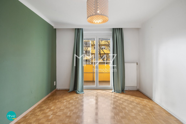 Das Vorzimmer, der Wohn-/Küchenbereich sowie die Nassräume sind verfliest, in den beiden Schlafzimmern sorgt Parkett für ein angenehmes Wohngefühl.