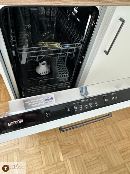Separate neue Einbauküche mit allen wichtigen E Geräten ausgestattet und einem großem offenen Wohn/Essbereich mit Zugang zum Balkon