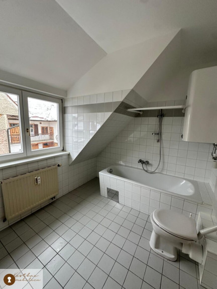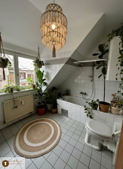 Badezimmer mit Badewanne, WC und Fenster
