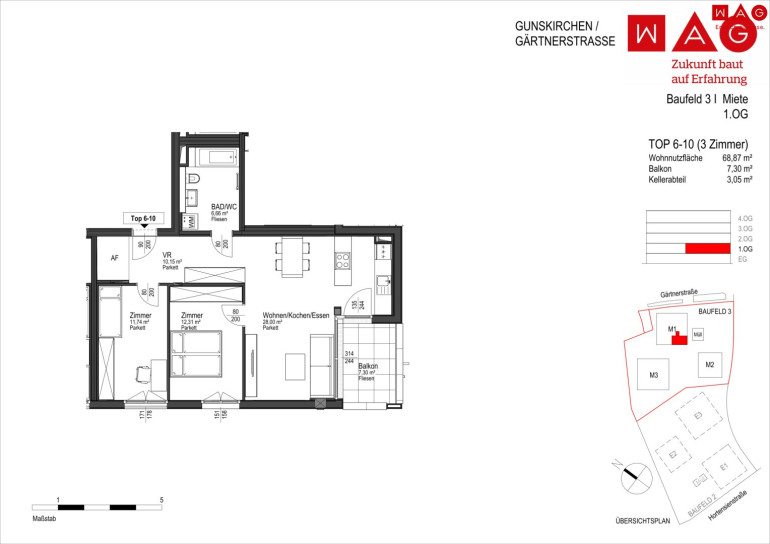 Am ehemaligen Sportplatz in der Gärtnerstraße in Gunskirchen errichtet die WAG drei moderne Wohngebäude mit insgesamt 60 geförderten Mietwohnungen und einer Tiefgarage mit 81 Stellplätzen. Die Anlage entsteht in nachhaltiger Hybridbauweise und bietet Wohnraum für unterschiedliche Lebenssituationen.