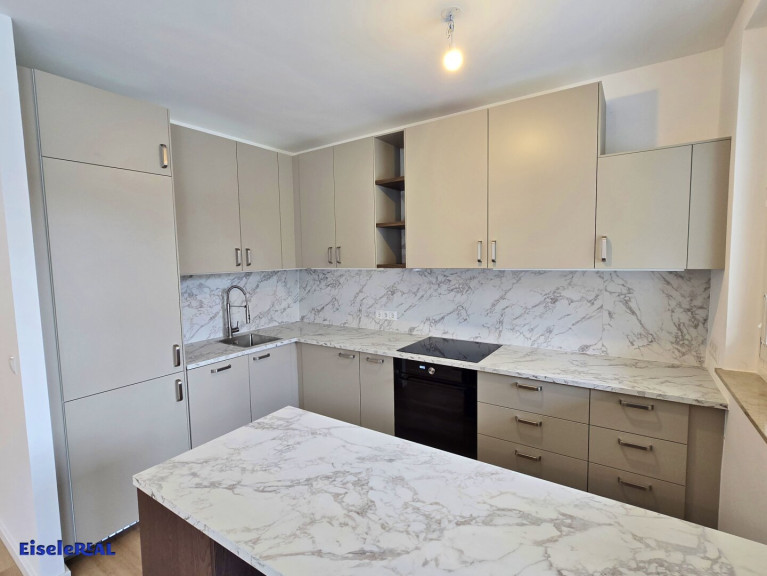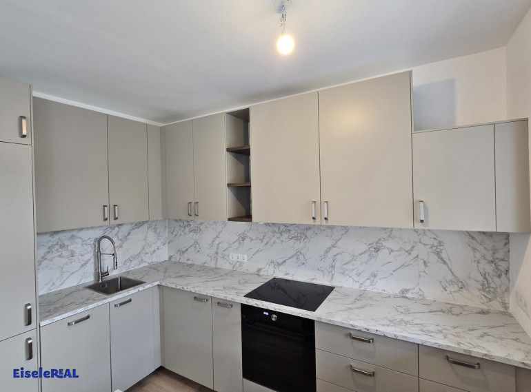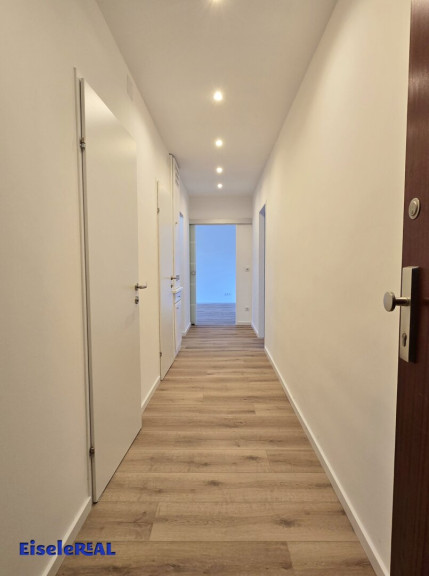 Sie betreten die Wohnung über einen langen Vorraum. Von hier aus erreichen Sie das sonnige Wohnzimmer, hier ist Platz für einen gemütlichen Ess-, Couch-, und Lebensbereich. Die neue Komplettküche ist gut in den Wohnraum integriert und doch ein einem eigenen Bereich.