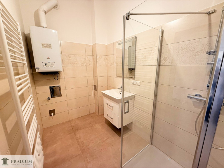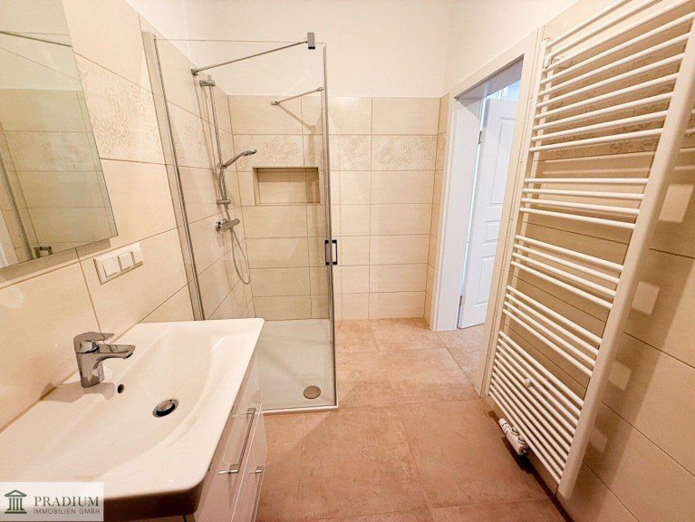 Vom Vorraum aus erschließt sich der optimal angeordnete Küchenbereich, der funktional und harmonisch in das Wohnkonzept integriert ist. Direkt anschließend befindet sich das hochwertig sanierte Badezimmer, modern gestaltet und mit exklusiven Materialien ausgestattet. Ein separates WC ist ebenfalls bequem vom Vorraum aus zugänglich.