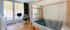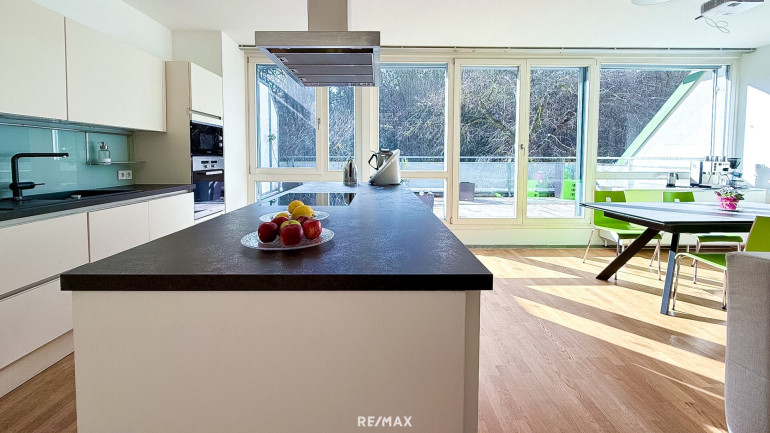 Der durchdachte Grundriss schafft ein harmonisches Zusammenspiel aus Offenheit und Privatsphäre. Der großzügige Wohn- und Essbereich mit Kamin bildet das Herzstück der Wohnung – ein Ort für gemeinsame Familienmomente und stilvolle Abende mit Freunden. Große Fensterflächen mit Beschattungsmöglichkeit sorgen für ein lichtdurchflutetes Ambiente und eröffnen einen herrlichen Grünblick.