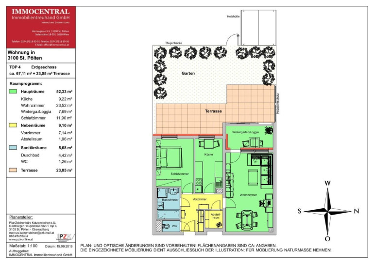 Raumaufteilung: Vorraum, Wohnzimmer, Loggia, Terrasse, Garten, Schlafzimmer, Bad, WC, Abstellraum