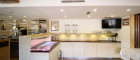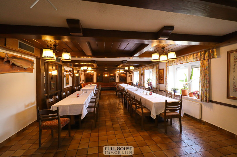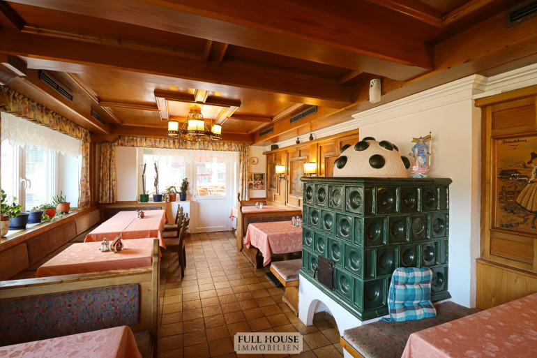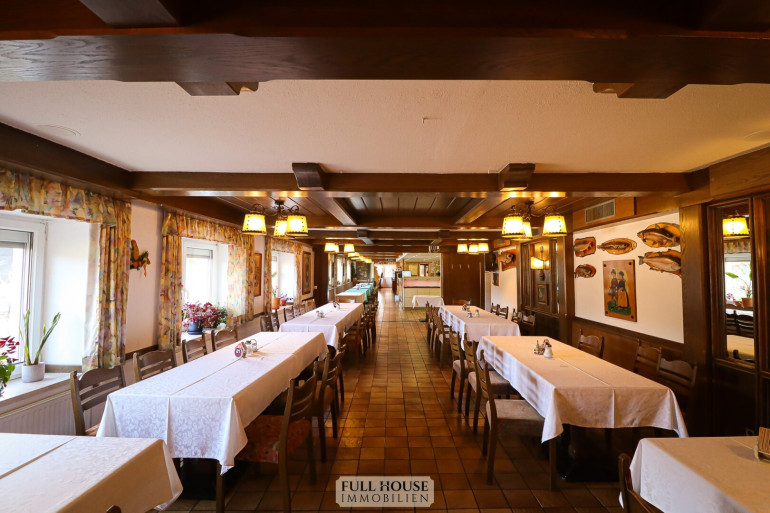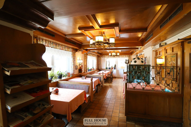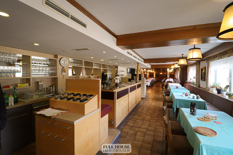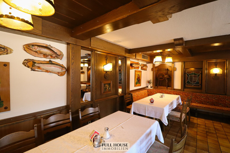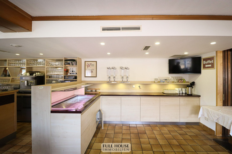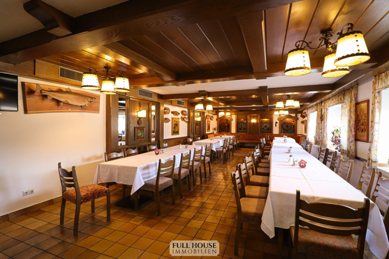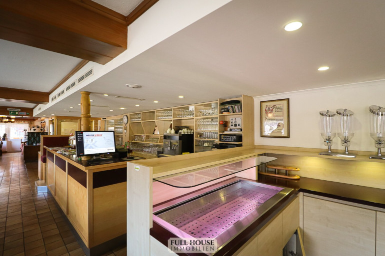 Der Gastraum bietet ca. 100 Sitzplätze, aufgeteilt auf zwei separat teilbare Bereiche. Beide Räume sind flexibel nutzbar, z. B. für Gruppen, Veranstaltungen oder den regulären Tagesbetrieb. Zusätzlich stehen eine Bar, ein Buffetbereich sowie ein zweiter Zugang zur Küche zur Verfügung, was für einen reibungslosen Ablauf im Service sorgt.