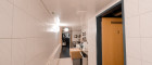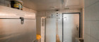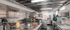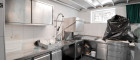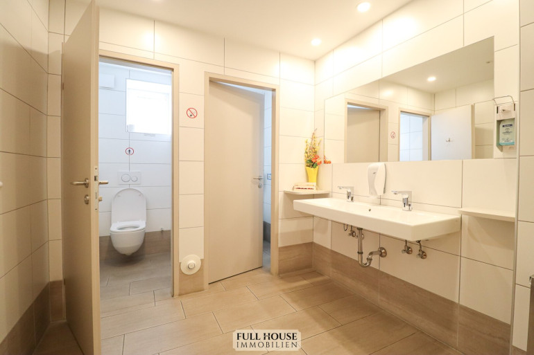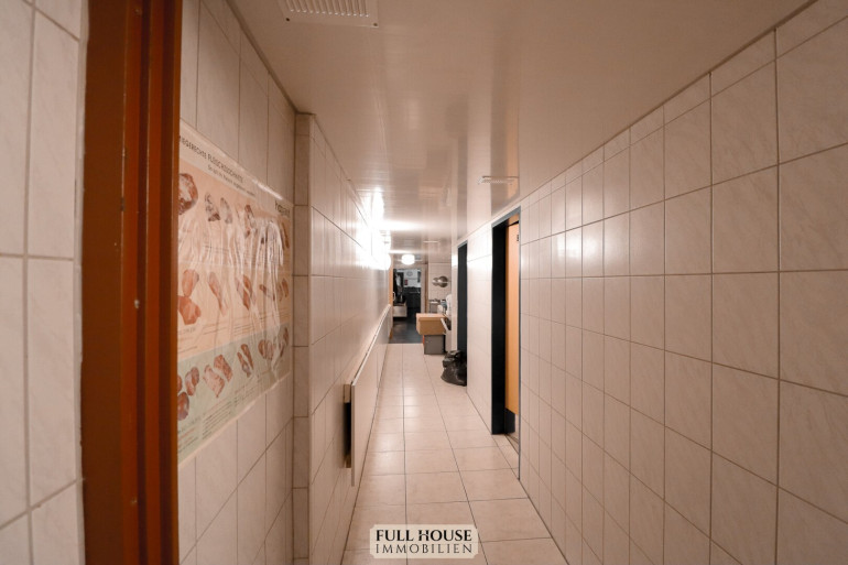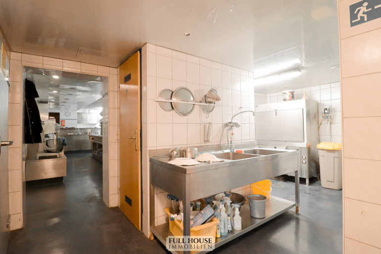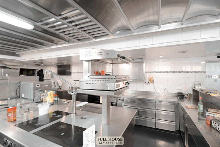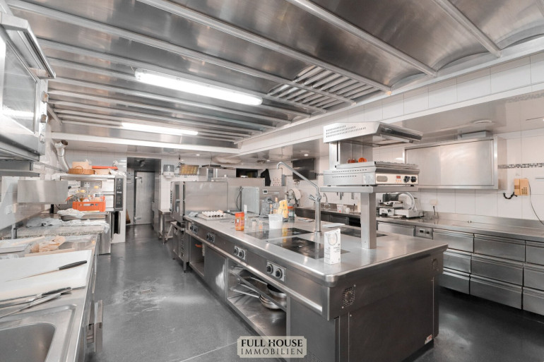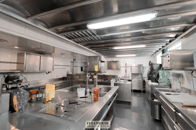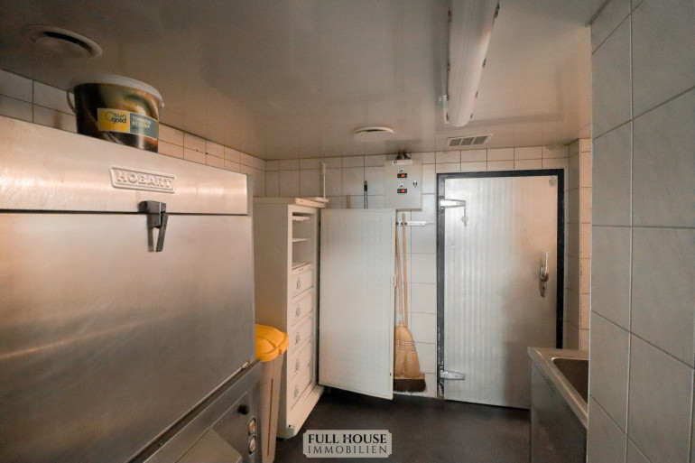 Der Küchen- und Mitarbeiterbereich ist funktional strukturiert: Direkt an den Gastraum angeschlossen befindet sich die moderne Gastronomieküche, vollständig eingerichtet und mit mehreren Arbeitsstationen ausgestattet. Von hier führt ein interner Flur zu den Kühlräumen, Lagerräumen, dem Büro, dem Mitarbeiter-WC und weiteren Abstellflächen. Alle Bereiche sind so konzipiert, dass Arbeitswege kurz und effizient bleiben.
