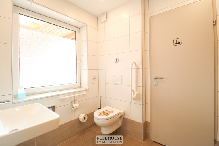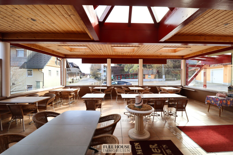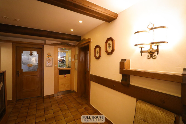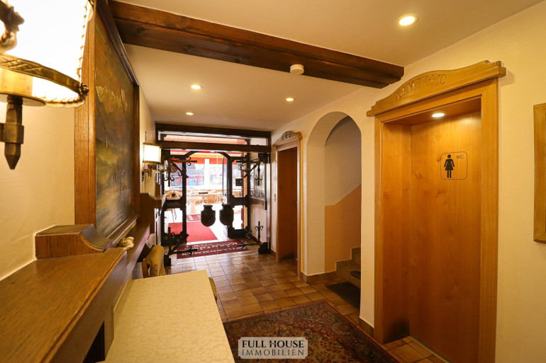 Beim Betreten gelangt man zunächst in den großzügigen Wintergarten, der rund 50 Sitzplätze bietet und sich hervorragend für Frühstück, Kaffeehausbetrieb oder Gruppen eignet. Von dort führt ein Gästeflur weiter in das Lokal. Entlang dieses Flures befinden sich die Gäste-Toiletten (Herren, Damen, barrierefrei), die kürzlich renoviert wurden und einen modernen Eindruck vermitteln.
