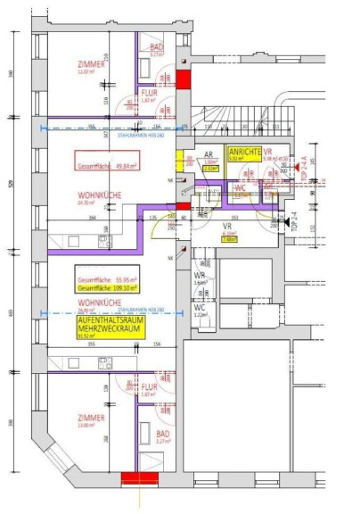 Zum Verkauf gelangt eine ca. 106m² große unrenovierte Altbaufläche, welche 2 in 2 Wohnungen umgebaut werden kann. Hierzu gibt es bereits eine Entwurfsplanung und die ursprüngliche Bürofläche wurde zwischenzeitlich bereits zu Wohnzwecken umgewidmet. Die leicht über dem Erdgeschoss gelegene Fläche verfügt über hohe Räume sowie große Fensterflächen und garantieren eine gute Belichtung.