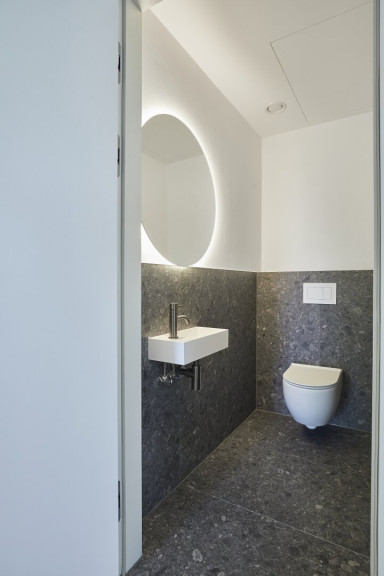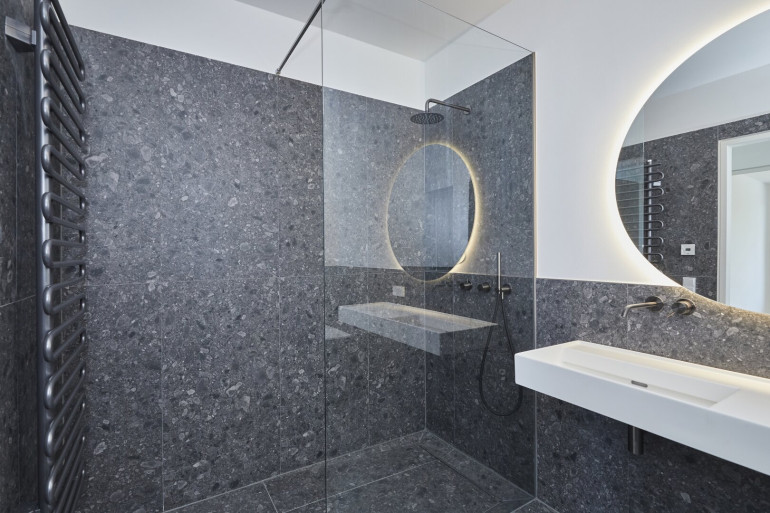 Das gesamte Badezimmer, sowie die Gäste Toilette sind Teil unserer "Gun metal black" Reihe und sind mit nobelster Ausstattung des zertifizierten italienischen Herstellers "Vallone" ausgestattet, der sich durch seine präzise Handarbeit und sein elegantes Design hervorhebt.