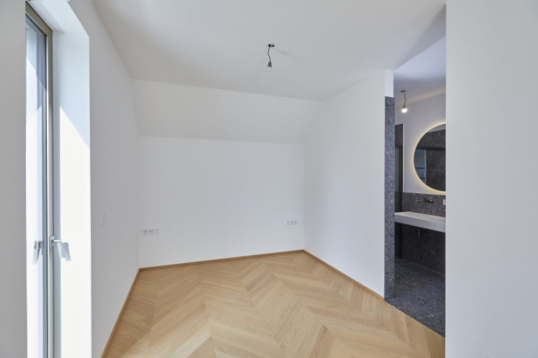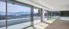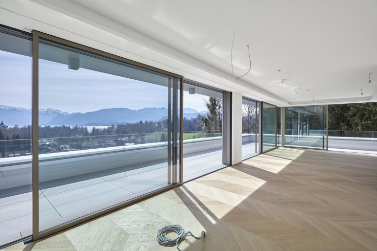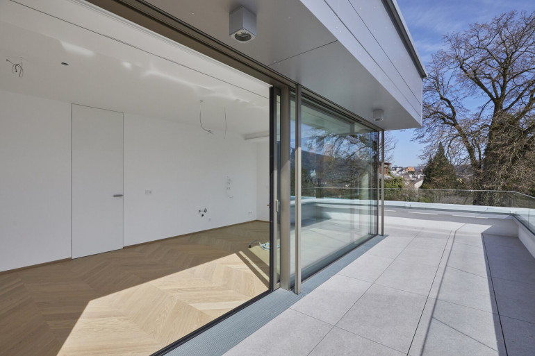 Die raumhohen Alluminium Fenster des Designers Josko mit Dreifachverglasung sorgen für optimale Wärmedämmung. Die Bedienung der Schiebeelemente ist durch das minimale Gewicht der Fenster spielhaft leicht möglich. Die verbauten “Josko ONE” und “Josko ONE S” Rahmen sind zudem nur 3 Finger breit und verkörpern somit den auch sonst in der Wohnung vorhandenen puren Luxus.