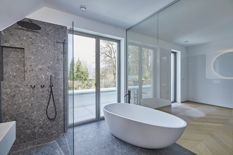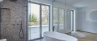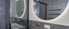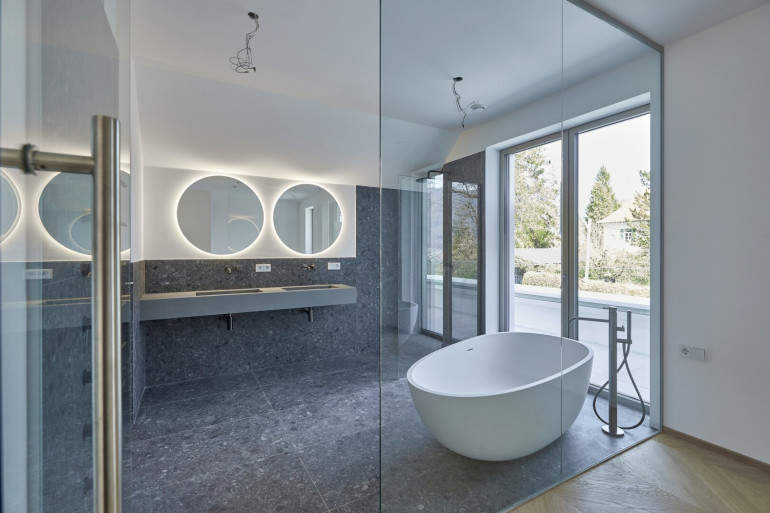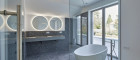 Beide On-Suite Badezimmer, sowie die Gäste Toilette sind Teil des Midnight Farbkonzepts. Jedes Badezimmer sowie die Toilette sind mit feinsten Designer Armaturen und nobelster Ausstattung des italienischen Herstellers "Vallone" ausgestattet, der sich durch seine präzise Handarbeit und sein elegantes Design hervorhebt.
