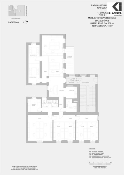 Die gegenständliche Bürofläche erstreckt sich über eine Gesamtfläche von ca392 m²und besticht durch eine durchdachte sowie funktionale Grundrissgestaltung: