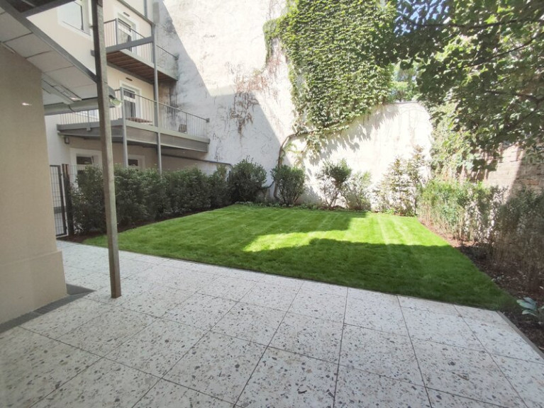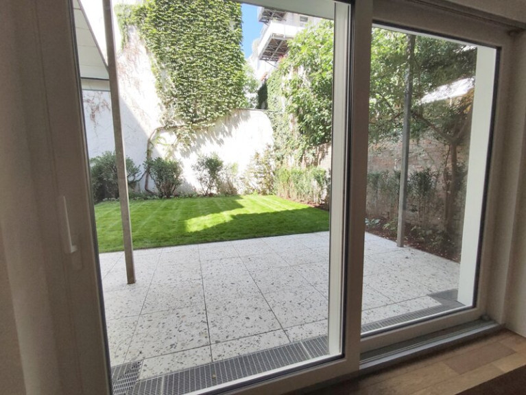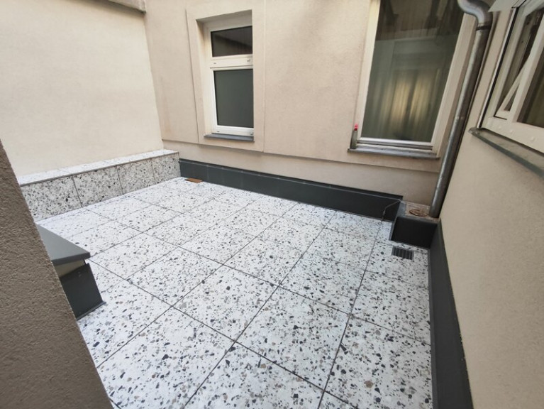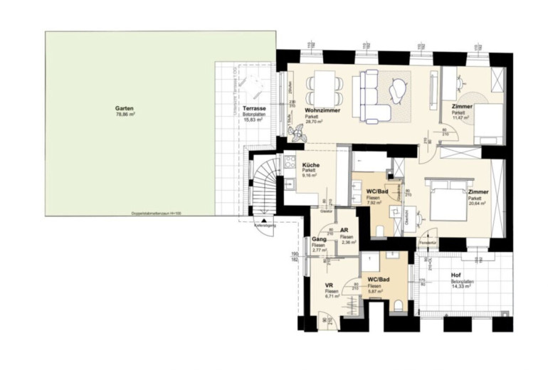 Der private Garten weist eine Fläche von ca. 79 m2 auf, die Terrasse (direkt vom Wohnzimmer aus zu begehen) misst ca. 16 m2. Zusätzlich steht noch ein Hofanteil mit ca. 14 m2 zur Verfügung.