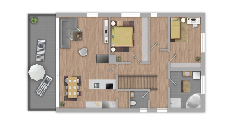 Die Garagen- und Kellerflächen im Untergeschoss wurden in Massivbauweise errichtet. Die Wohnung im Obergeschoss wurde als Holzriegelbau von der renommierten Firma Hartl Haus ausgeführt.