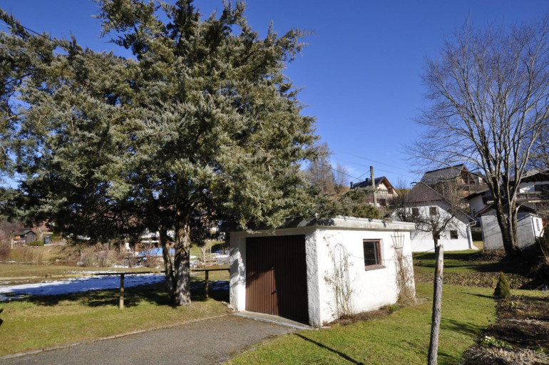 Im Garten befindet sich ein Garagengebäude.