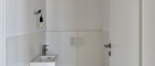 Das Badezimmer präsentiert sich modern und stilvoll zugleich. Großformatige Feinsteinzeugfliesen, eine Badewanne, eine bodengleiche Dusche mit Edelstahlablaufrinne sowie hochwertige Markenarmaturen schaffen ein komfortables Wohlfühlambiente. Ein elektrischer Handtuchheizkörper ergänzt die Ausstattung funktional und elegant.
