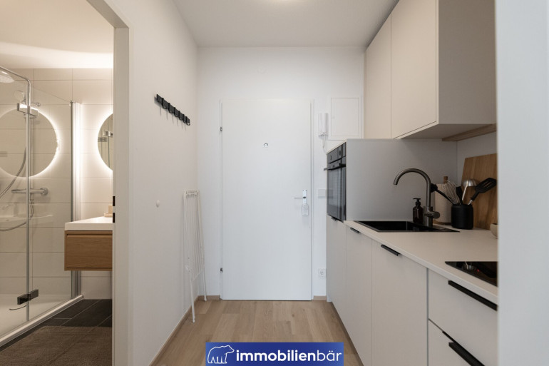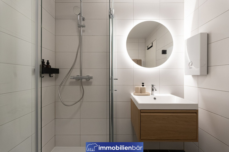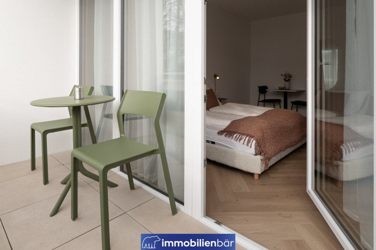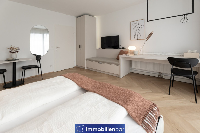 Das „Studio 4“, Top 3, ist komplett möbliert und clever aufgeteilt: Wohn-/Schlafbereich mit integrierter Küche, Badezimmer mit Dusche und WC, TV sowie Internet – alles bereits vorhanden.