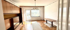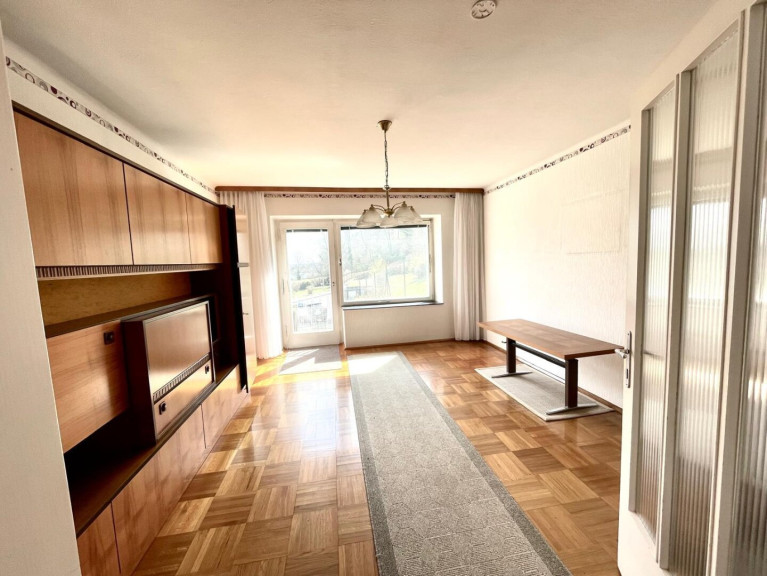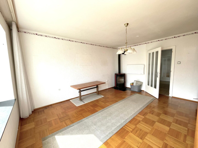 - Wohnzimmer, südseitig gelegen, mit dem großen Fenster und der Balkontür zum Vorgarten sowie einem Schwedenofen;