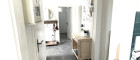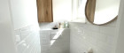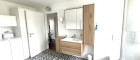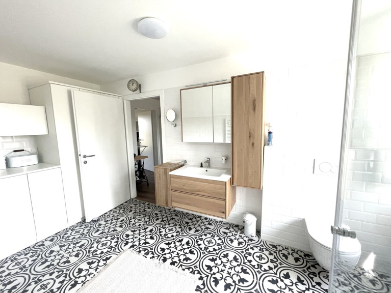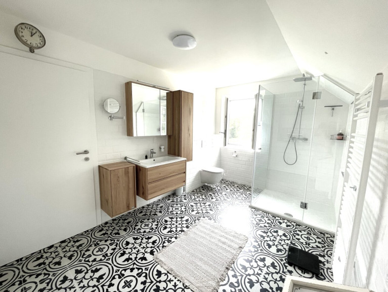 -Badezimmer: Hell und freundlich, mit dem großen Fenster, der Dusche mit Glaswand, dem Waschbecken, dem Hänge-WC, dem großen Handtuch-Heizkörper und genügend Stauraum;