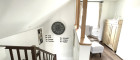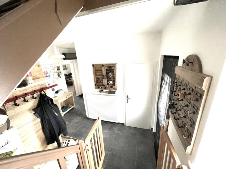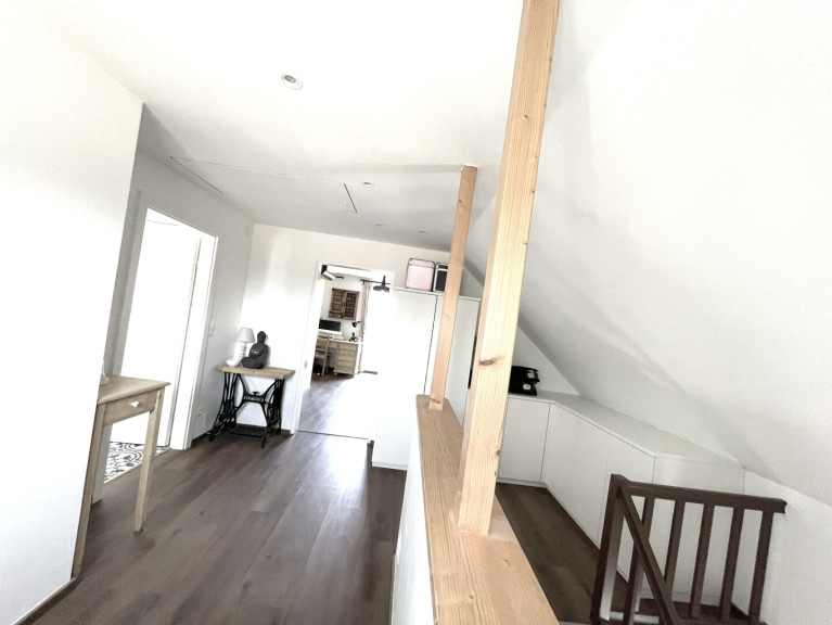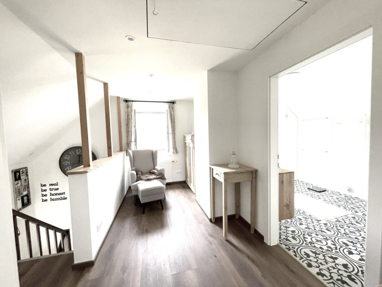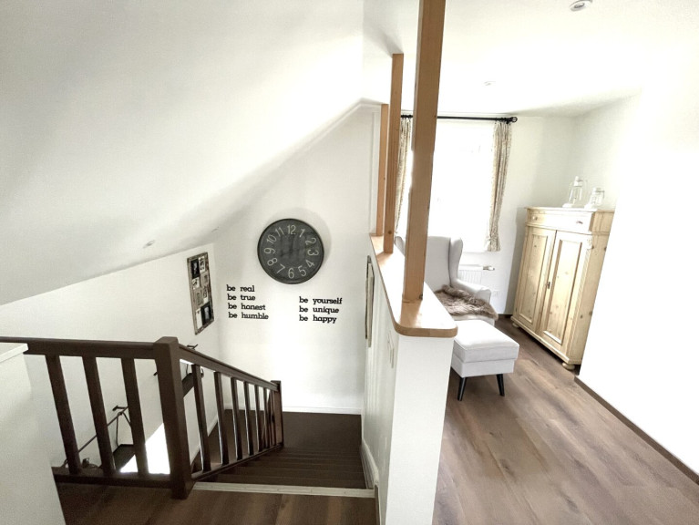 Die solide Massivholztreppe führt ins Obergeschoß und wirkt durch die offen gestaltete Galerie hell und einladend freundlich.