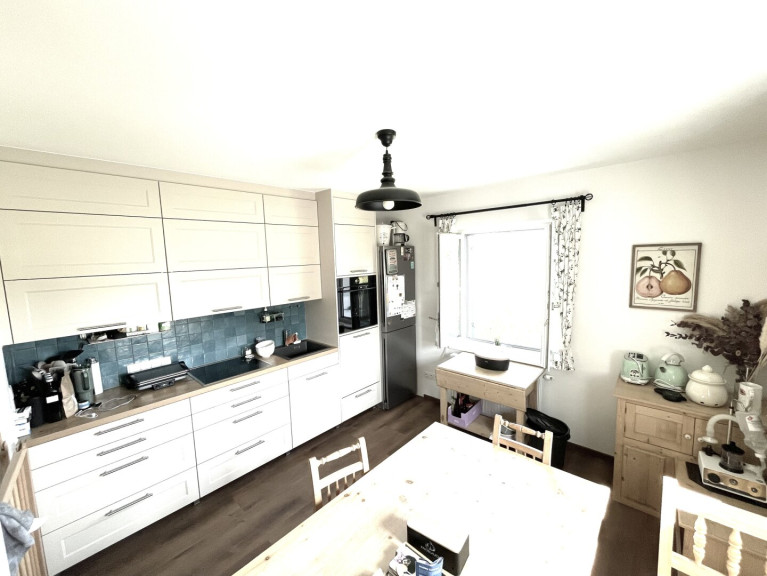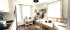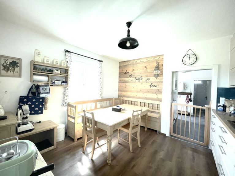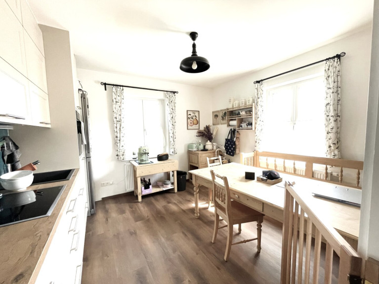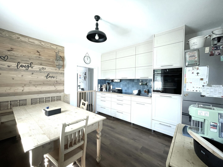 -Wohnküche: Die Küchenzeile beinhaltet den Geschirrspüler, die Edelstahl-Kühl-Gefrierschrankkombination, das Ceranfeld, das Backrohr auf Augenhöhe, den Dunstabzug, die Spüle; Der Essbereich lädt mit seinen Massivholznaturmöbeln, der Ecksitzbank und dem großen Tisch zum genussvollen Essen im Kreise seiner Liebsten, gemütlichen Beisammensein mit der Familie und Freunden, oder auch zum Lesen und Arbeiten ein.