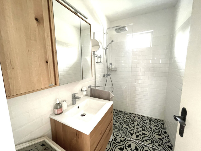 -Badezimmer: Begehbare Dusche mit Glaswand, Waschbecken, Handtuch-Heizkörper und Fenster;