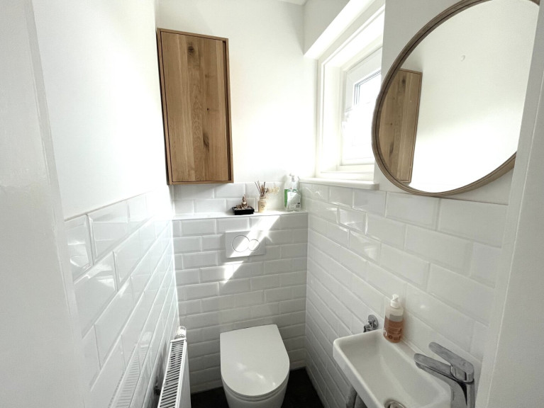 -Extra WC: Hänge-WC, Waschbecken, Heizkörper und Fenster;