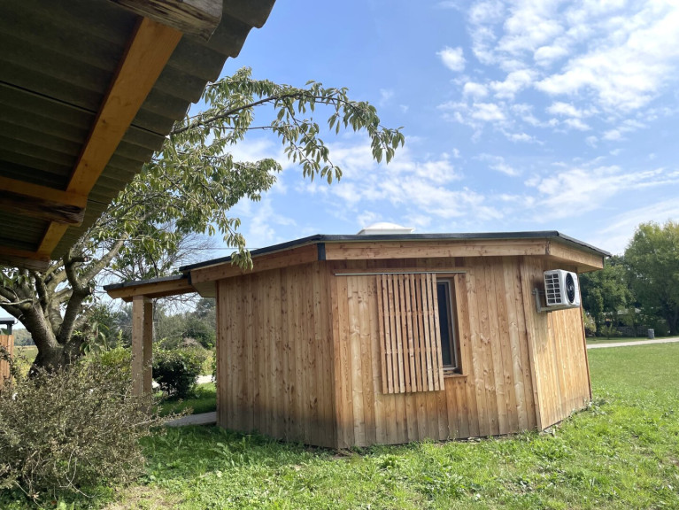 *Oktagon: In Riegelbauweise gedämmt, mit einem Betonfundament, der Lichtkuppel, einer Holzverkleidung im Innenbereich, der Klimaanlage zum Kühlen und Heizen, den doppeltverglasten Kunststofffenstern mit Schiebefensterläden;
