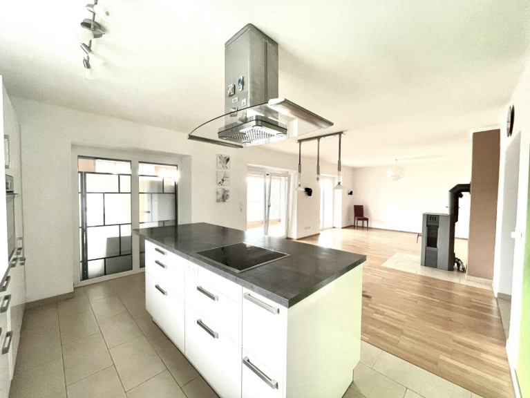 *Erstes Zimmer: Loftähnlicher sehr großer Raum mit traumhaftem Fernblick und Zugang zum Wintergarten durch drei Doppelbalkontüren; Hier befinden sich der Wohn-, Ess- sowie der Küchenbereich mit der Kochinsel mit Touchscreen Herdplatte, dem Dunstabzug und der Küchenzeile mit zusätzlichem Fenster sowie dem Zugang zum